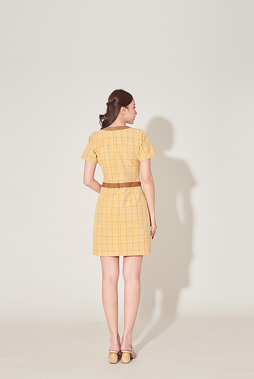 เดรสคอกลมทรงเรียบร้อย แต่งกุ๊นหนาโค้งลงมาใต้เอว แต่งกระดุมปั๊ม กระโปรงทรงเอนิดๆใส่ง่ายๆและใส่ได้บ่อย มีซับในซิปซ่อนหลัง