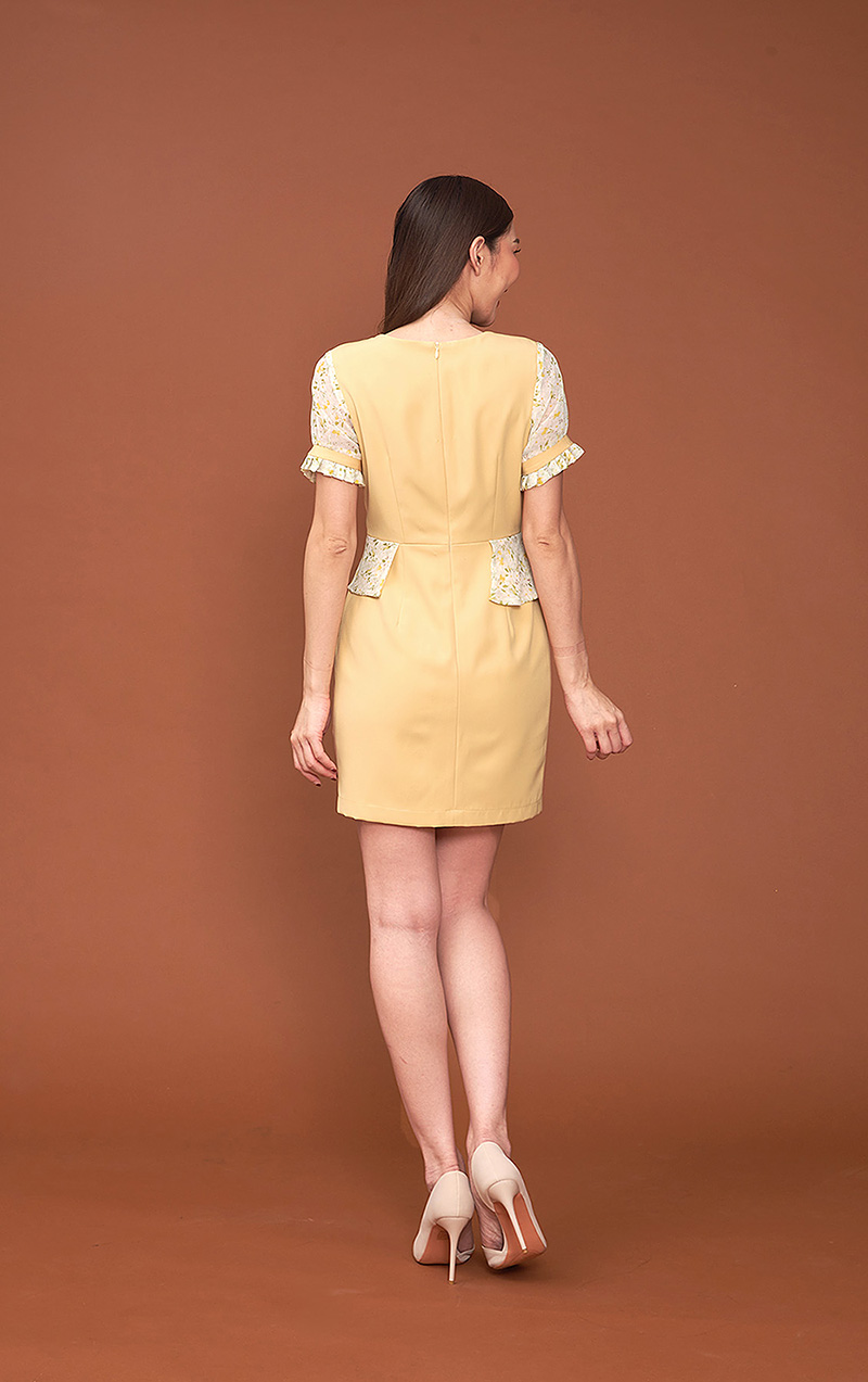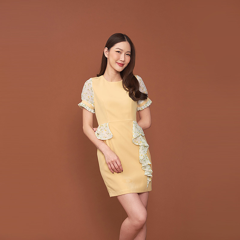 ชุดคอกลมสุดหวาน เรียบร้อยและละมุน ตกแต่งผ้าลายดอกเล็กที่แขน มีระบายเล็กแต่งที่ปลาย และระบายด้านหน้าสองข้าง ผ้าตัวเป็นอะมอลซิล มีซับในซิปซ่อนหลัง