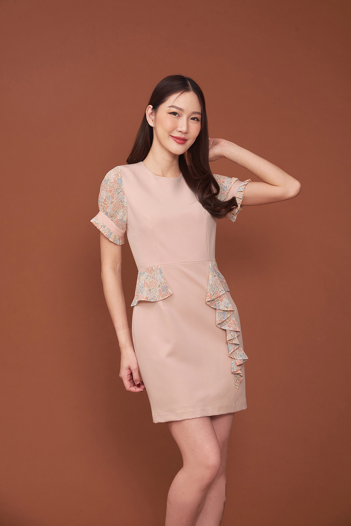 ชุดคอกลมสุดหวาน เรียบร้อยและละมุน ตกแต่งผ้าลายดอกเล็กที่แขน มีระบายเล็กแต่งที่ปลาย และระบายด้านหน้าสองข้าง ผ้าตัวเป็นอะมอลซิล มีซับในซิปซ่อนหลัง