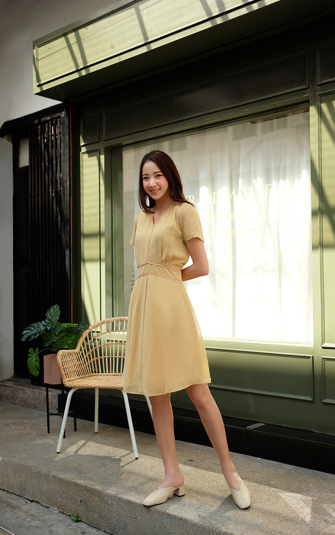 เดรสผ้าชีฟองทรายเนื้อดี ทรงคอวี จีบเอว แต่งกุ๊นรอบคอแลขอบเอว กระโปรงย้วยต่อกลาง มีซับใน ซิปซ่อนหลัง