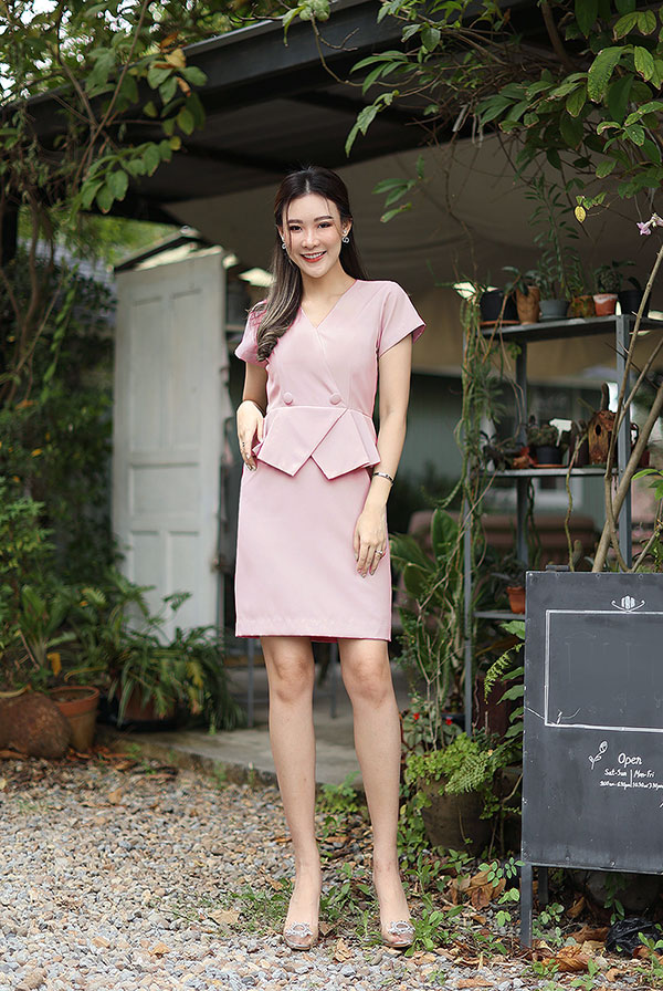 ชุดสีพื้นเรียบหรู คอป้าย ระบายซ้อนสวยๆที่รอบเอว แต่งกระดุมปั้มที่ตัวเสื้อ ทรงกระโปรงสอบ ผ้าเปเป้ มีซับในซิปซ่อนหลัง