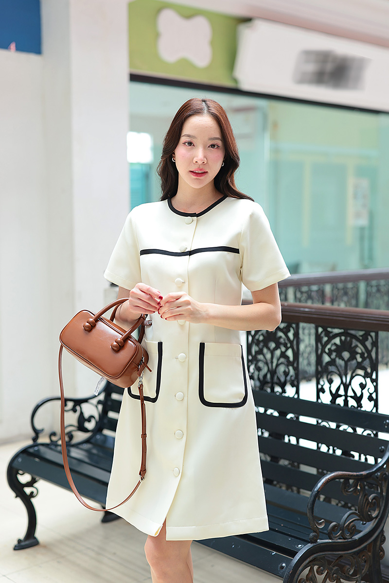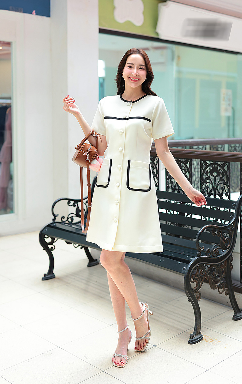 ชุดทรงคุณหนูผู้ดี คอกลมแต่งกุ๊นรอบคอ ที่อก และขอบกระเป๋าหน้า เปิดและติดกระดุมปั้มด้านหน้า ผ้าเปเป้อัดกาว ทำให้อยู่ทรงบานสวยแ
